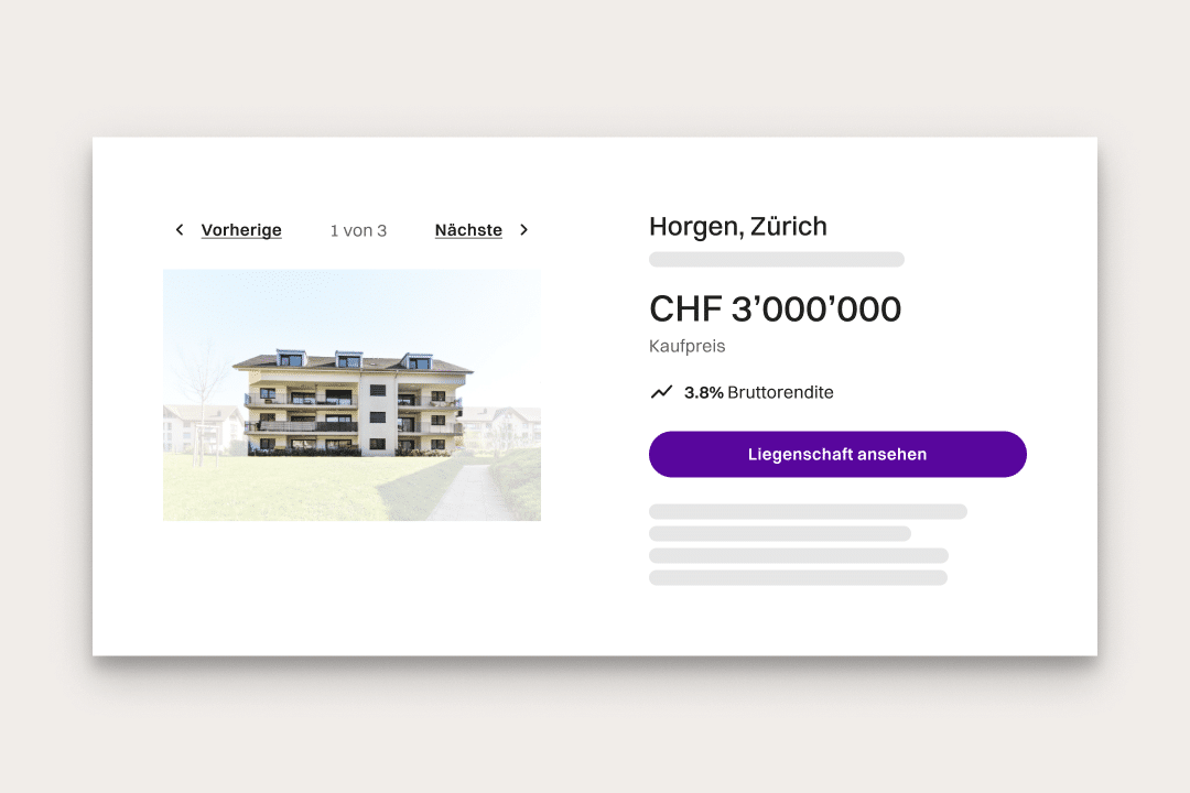 Nein. Propportunity funktioniert komplett datenbasiert. Es gibt auf Propportunity keinen offenen Marktplatz, auf welchem Sie aktiv nach Liegenschaften suchen können. Liegenschaften werden Ihnen basierend auf Ihrem Investment-Profil empfohlen.